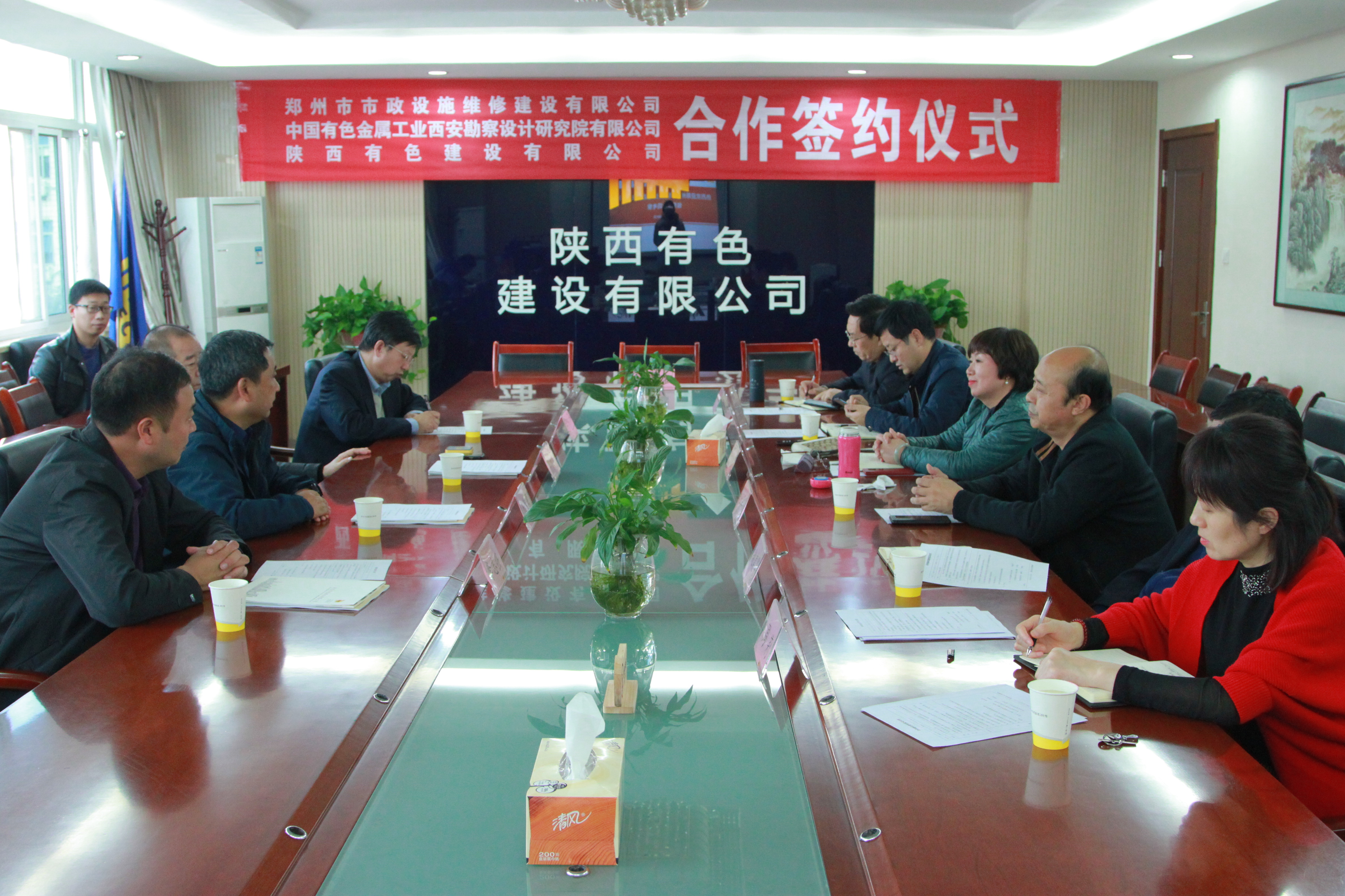 11月21日,我公司、有色西勘院有限公司與鄭州市市政設施維修建設有限公司(以下簡稱“鄭州市政公司”)在西安簽署合作協議。有色西勘院有限公司副總經理王軍成、有色陜建黨委書記、董事長盧曉嵐和鄭州市政公司董事長兼總經理楊智勇分別代表三方在合作協議上簽字。鄭州城基市政環??萍加邢薰究偨浝砝钪緩?、有色西勘院有限公司經營部部長何軍、公司總工程師杜輝及相關職能部門負責人參加了此次合作協議簽約儀式。