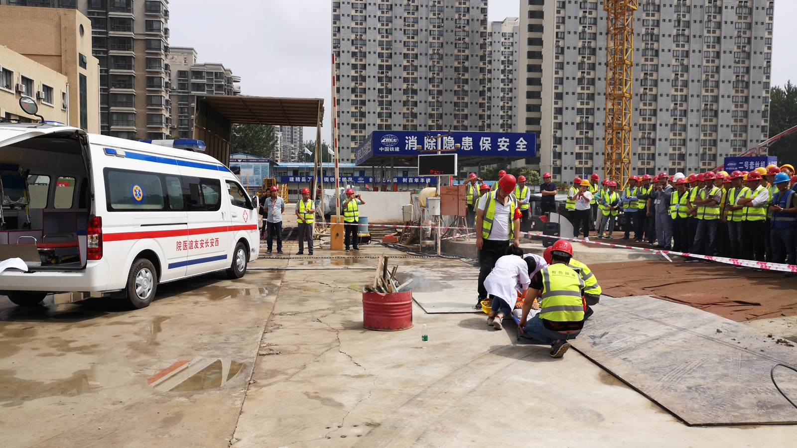 儀式結束后,項目部組織開展了消防應急演練,項目經(jīng)理孫杰擔任應急演練指揮,本次演練模擬因違章作業(yè),造成木工棚著火,致使施工人員燒傷并窒息。工人發(fā)現(xiàn)起火后立即進行自救,但由于火勢較大,火勢沒有得到有效控制,并在自救過程中被火燒傷,吸入大量濃煙導致窒息,情況較為危險。項目安全員發(fā)現(xiàn)此情況,立即報告項目經(jīng)理,項目經(jīng)理得知此事后立即啟動消防應急預案,并組織各救援小組開展救援活動。警戒疏導組在發(fā)生火災后立即對現(xiàn)場人員進行疏散,并設立警戒線,確保現(xiàn)場人員及時逃生避免二次傷害。醫(yī)療組立即對傷員進行臨時救治,并撥打120急救電話,簡單救治后將傷員轉移至安全地帶等待救護車。救援組立即采用滅火器對現(xiàn)場火勢進行撲救,明火撲滅后對著火點進行清理。救護車達到現(xiàn)場,將傷員送至醫(yī)院進行救治。救援組待火勢完全熄滅并確認現(xiàn)場安全后,將場地進行清理,施工現(xiàn)場恢復正常,消防演練結束。