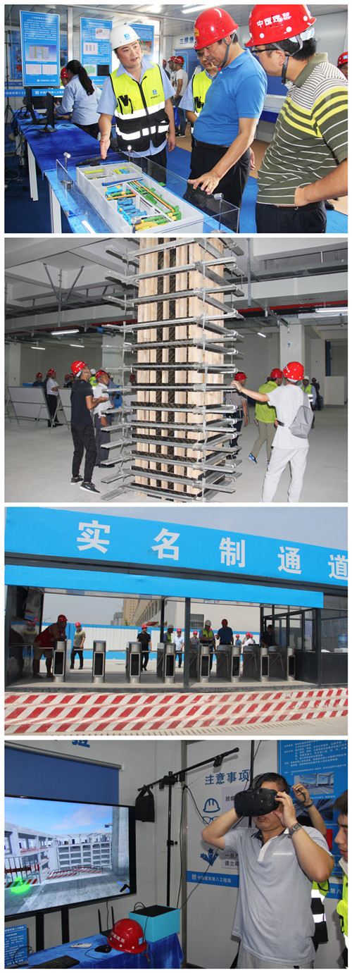 觀摩人員先后參觀了辦公生活區、安全體驗區、“互聯網+”體驗中心、BIM+VR+3D打印大數據中心和生產區。其中:云筑網建筑工人實名制管理平臺、“互聯網+質量/安全/物資”展示、BIM深化設計、VR安全教育體驗、3D打印建筑模型、AR圖紙識別技術、方圓扣自鎖模板、鋼筋綁扎定位、定型化工具式通道等施工亮點引人關注。
